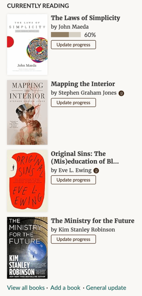My habit of bouncing around different books is something I would like to improve. So I now tag all the books I have started as “currently reading” in my Goodreads account. Just seeing this list, and knowing it is public, has created a healthy accountability system to finish or abandon each book.
