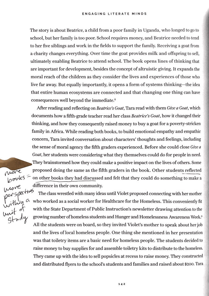 With Engaging Literate Minds, there were so many ideas to capture. Having a purpose for reading was essential. In addition, the margins can become cluttered if I am writing too much of a response. So I follow the "5 and 5" rule: No more than five words underlined and no more than five words written. (As you can see in the image, the rule is more guidance.) The point to be made is: when reading, it is not (yet) the time to write.