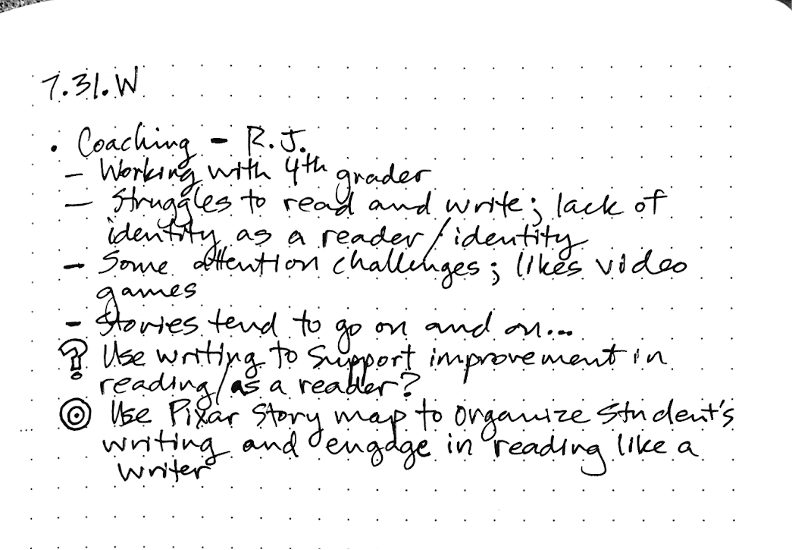 For example, during a coaching conversation I wrote down a few interesting points made by a client. R.J., a 4th grade teacher, was concerned about at student she was supporting over the summer. He was not identifying as a reader.
