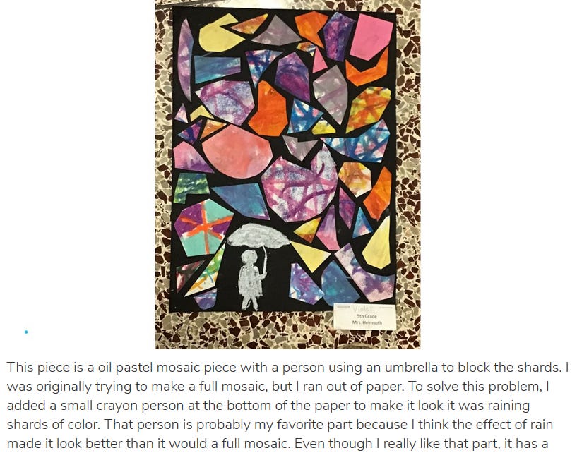 Later in her reflection, she shared a critical assessment of her drawing skills. In my comment, I added that I thought the way she drew the person with the umbrella fit nicely with the mosaic. Both her reflection and my follow-up comment focused on the work, using terms of the discipline and how this piece represented her learning. Including a score or a grade in the assessment process here makes little sense.