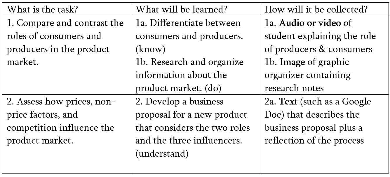 This process of delineating the activities and assessments necessary for completing the task can be done with students. It serves as a rubric, only better: we are describing a standard of excellence instead of how to achieve a certain score.