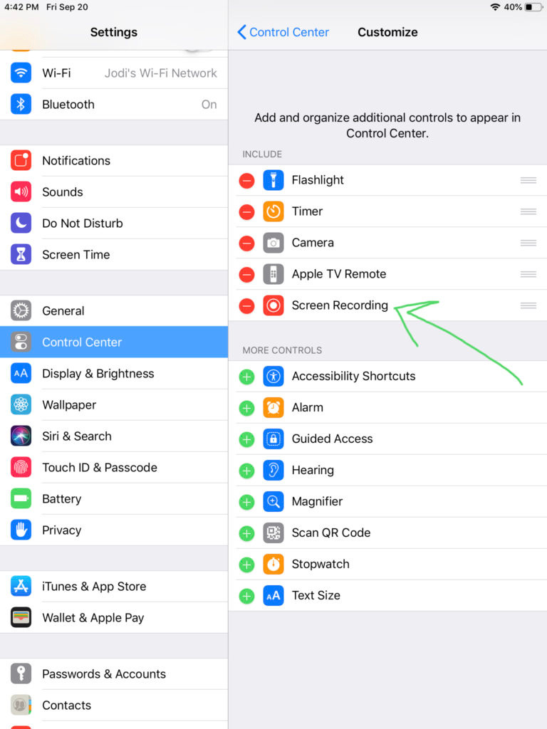 Go to your settings, select "Control Center", then "Customize Controls", and drag the "Screen Recording" option to the "Include" menu.