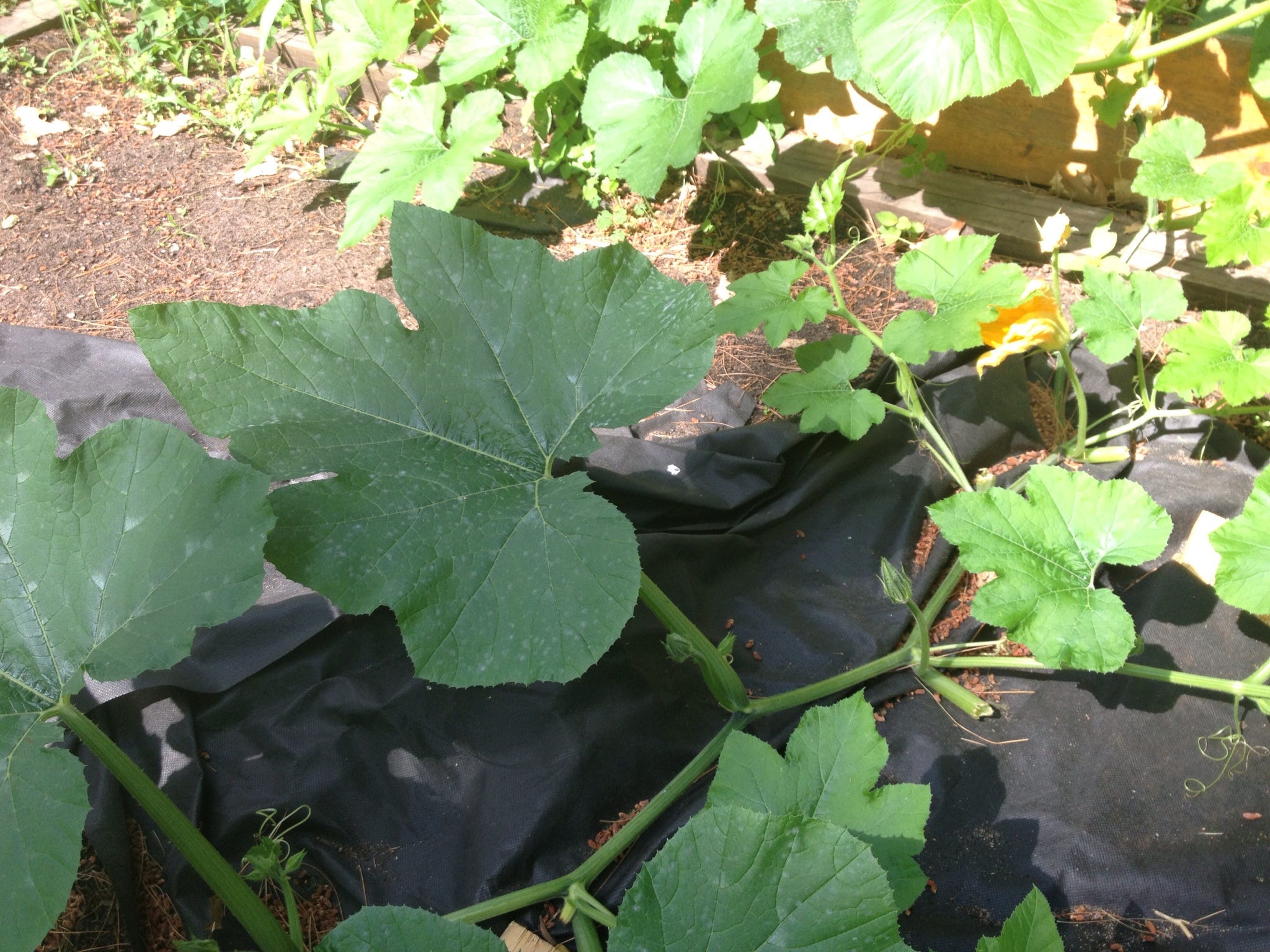 This is a picture of our pumpkin plant. Every year my family and I try to grow some type of squash. And every year, our plants get hit with powdery mildew. This disease is represented in the asymmetrical white spots on the leaf in the middle. I try to keep it at bay by pruning off the leaves with obvious signs of powdery mildew, in hope that this sacrifice will give new leaves time to grow with less chance of being afflicted.